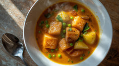 A fragrant, coconut-based curry soup with tender salmon, vegetables, and warming spices. Serve in pasta bowls with new potatoes.